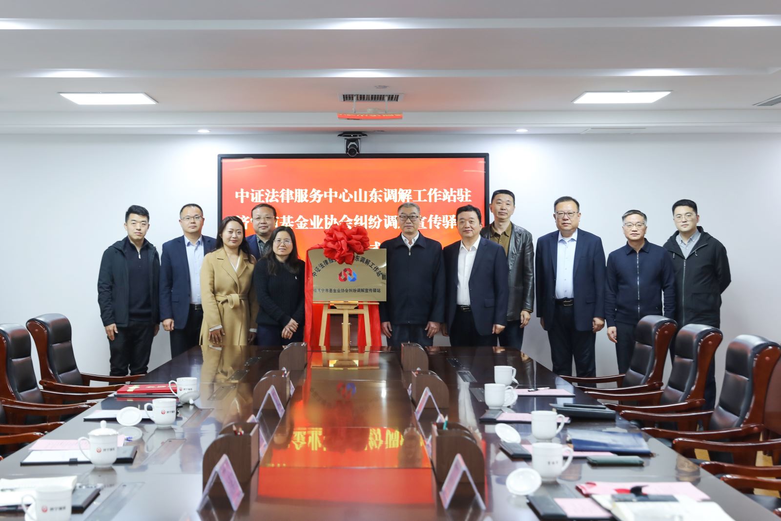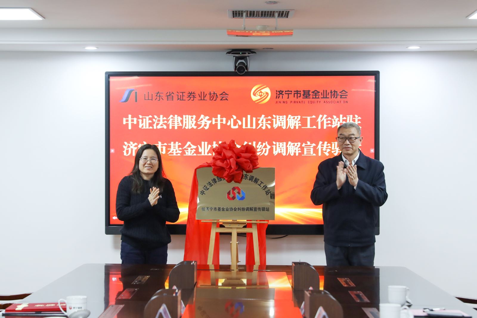 随后,郑家文与济宁市股权投资基金业协会常务副会长、秘书长宋斌亭共同签署合作协议。孙素美与赵劲松共同为“中证法律服务中心山东调解工作站驻济宁市基金业协会纠纷调解宣传驿站”揭牌。